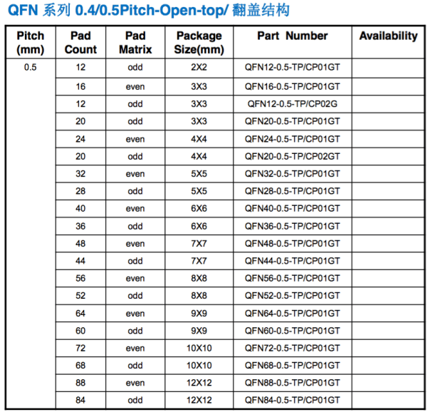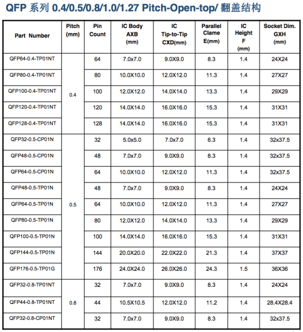 QFP/QFN QFP 32-0.5翻蓋彈片測試座 Package : QFN 32 Pitch : 0.5 mm Body Size : 5 x 5 mm 其他規格均有翻蓋及下壓兩種結構選擇 QFN 44-0.5 下壓彈片測試座 Package : QFN 44 Pitch(mm) : 0.5 Body Size : 7 x 7 其他規格均有翻蓋及下壓兩種結構選擇